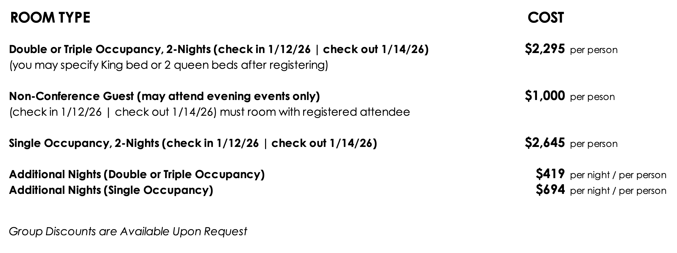 Note: There will be two financial transactions - one when you register and one paid directly to the reosrt for any additional nights and/or room upgrades.